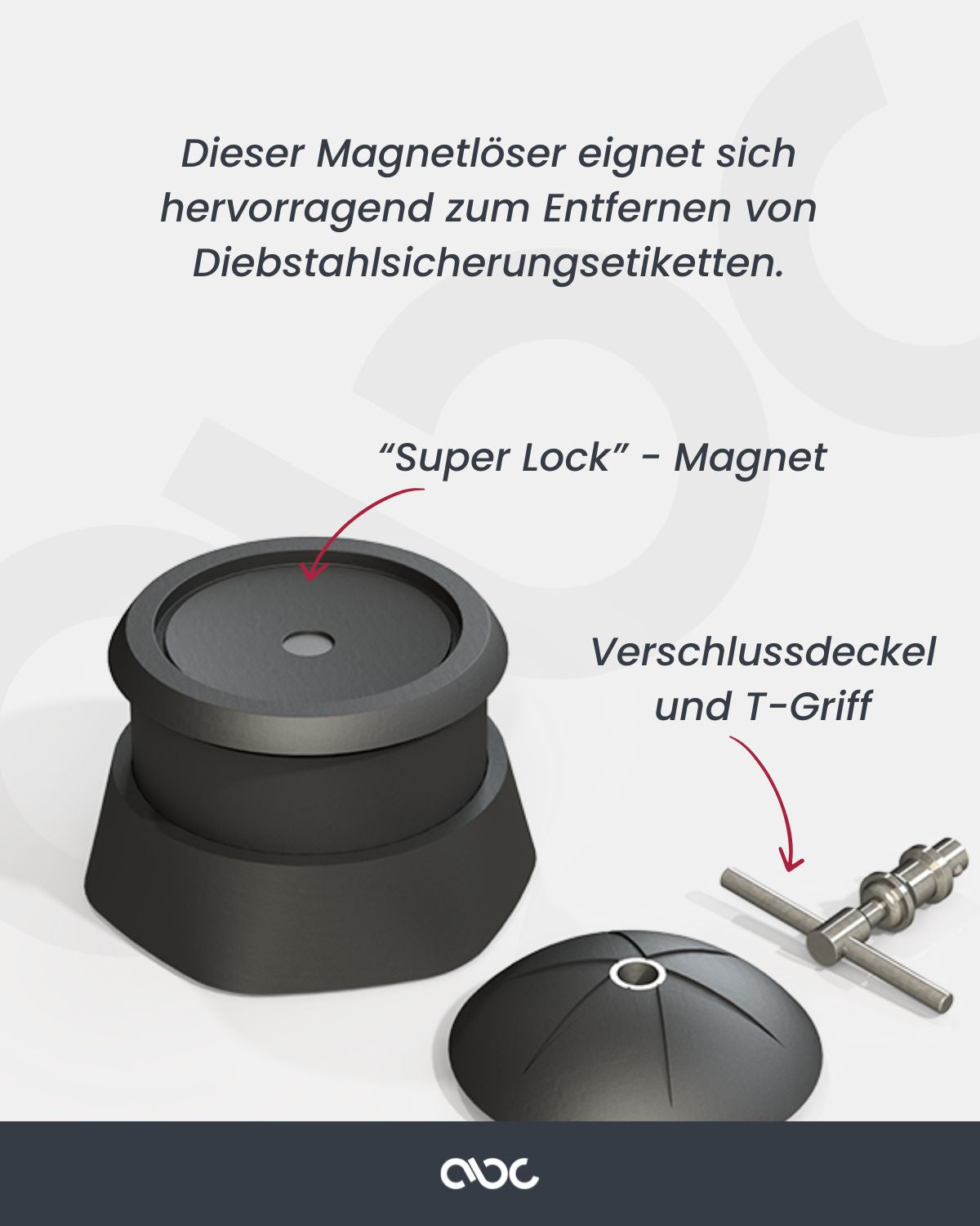 Dieser leistungsstarke magnetische Entferner wurde entwickelt, um nahezu alle derzeit auf dem Markt erhältlichen magnetischen Sicherheitsetiketten zu entfernen, einschließlich unserer speziellen Etiketten zur Sicherung von Getränkedosen (dieses Gerät öffnet keine Sensormatic Super-Etiketten).