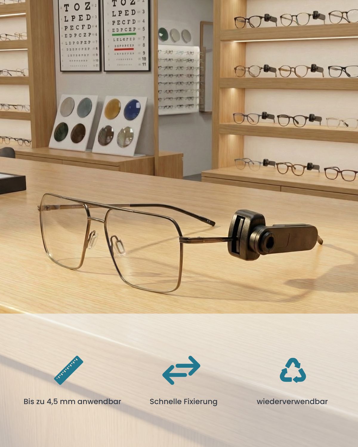 Kundenfreundliches Design: Die schlanke, flache Form sitzt an der Seite des Bügels, sodass Kunden die Brille anprobieren und sich ungehindert im Spiegel betrachten können.
